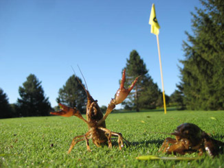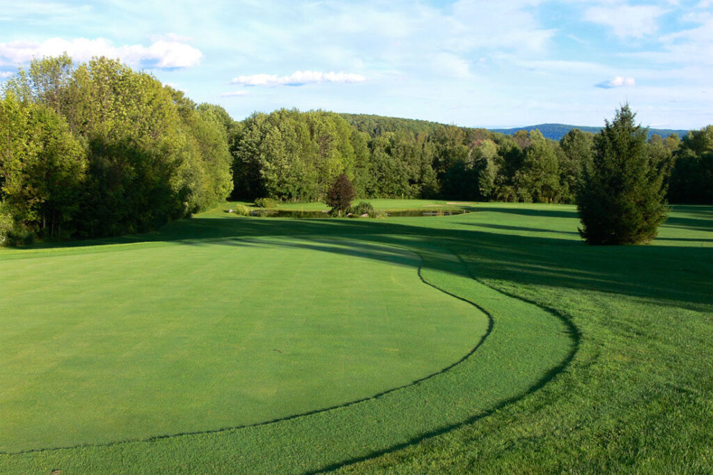 Small practice green on the front nine, near the clubhouse. Large practice green with a sand trap, on the back nine.