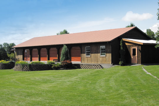 Overlooking the golf course, in a large open field, is our rustic style pavilion, with an outdoor patio, sand volleyball court and horseshoe pits.